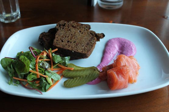 We ordered an appetizer of smoked salmon with beetroot mousse, rye bread, and gherkins. The mousse was really something special, but when you got a perfect bite with each item on the plate it was mouth watering. Usually €5.50