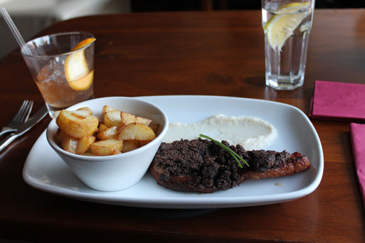 Nathan ordered the Northern Irish Bacon Chop (Usually €10.95) with traditional black pudding, garlic potatoes, and cauliflower puree. We’d never seen bacon served as a slab, but it was pretty epic, and yes he ate the whole thing. It was a little on the salty side, but well worth the experience. The cauliflower was amazing and left us searching for a recipe!